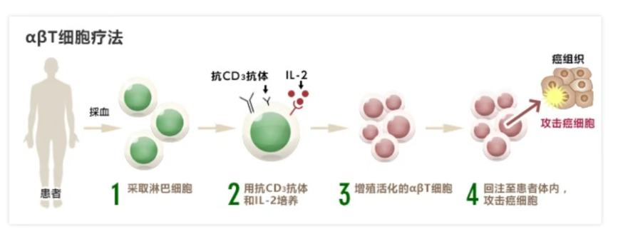 a・βT细胞是细胞毒性T细胞的一种,成熟的细胞毒性T细胞受抗原刺激后,分化为效应细胞毒性T细胞和记忆细胞毒性T细胞。前者能特异性杀伤可被识别抗原的靶细胞,如移植细胞、肿瘤细胞及受微生物感染的细胞等。T细胞的杀伤力较强,可反复杀伤靶细胞。a・βT细胞活化后,是对癌细胞攻击力最强的一种免疫细胞,广泛适用于各种早期癌症。