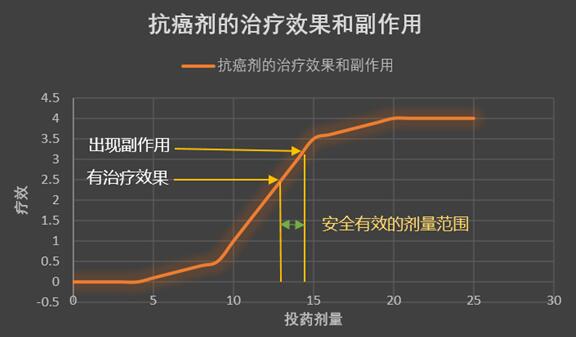 癌细胞是自体正常细胞发生变异,癌变的产物,化疗药物不但攻击癌细胞,也攻击正常细胞。癌细胞具有比正常细胞分裂快的特性,很多化疗药物的研制都立足这一点,尽量使细胞毒性作用于癌细胞。但是,人体内的细胞分裂周期本身有快有慢,毛发细胞、粘膜细胞、表皮细胞等的细胞周期更接近于癌细胞周期,因此治疗时无论怎样努力都避免不了伤害这些正常细胞。这就是化疗抗癌剂最容易产生副作用的原因。抗癌剂的种类以及药量,要同时考虑治疗效果和副作用,须谨慎使用。既能对治疗有效又很少出现副作用的剂量范围本身非常狭窄,如下图所示。
