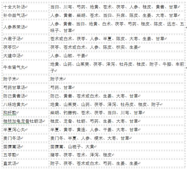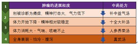 癌细胞可以用多种形式夺走患者的健康。疲倦、食欲不振、免疫力低下等为患者带来烦恼,这些烦恼必定会进一步造成患者体力和精神损失,从而为癌细胞创造良好的生存环境。为了营造能遏制癌细胞环境,患者需要修复和调整身心到一个良好的状态,中药也是调整整体状态的补药。最具代表性的补药是十全大补汤和补中益气汤,人参养荣汤也是癌症患者经常服用的补药。下表按癌症的进展程度举例推荐一些中医药剂。