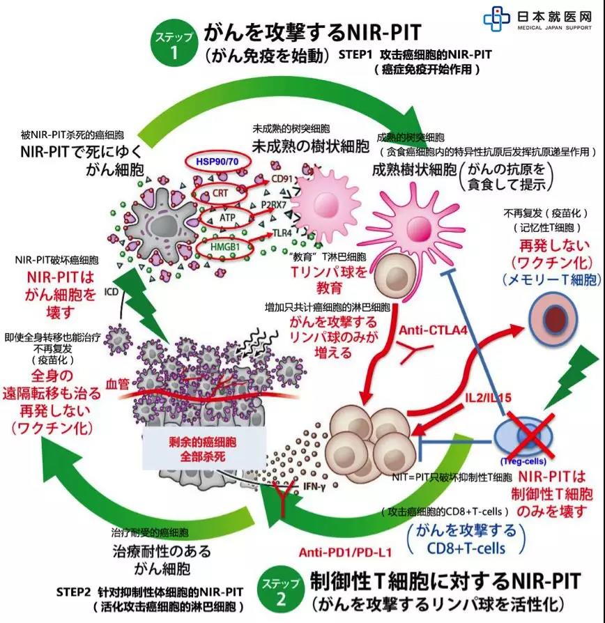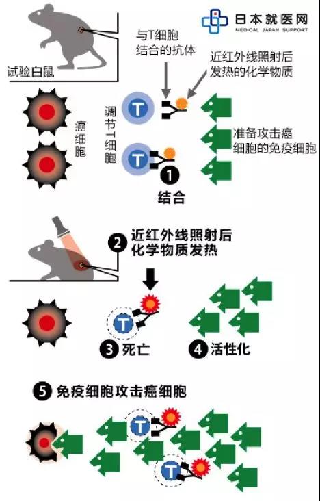 (注2): 攻击抑制性T细胞的方法:攻击癌细胞附近妨碍免疫细胞攻击癌细胞的抑制性T细胞的方法。注射近红外线物质(IR700)附着抗体,物质与抑制性T细胞结合,光敏后抑制性T细胞死亡。也就是将癌细胞附近的免疫细胞开关从“OFF”扳到“ON”的过程。免疫细胞开始攻击癌细胞。免疫细胞还能随血流继续攻击体内其他部位的癌细胞。