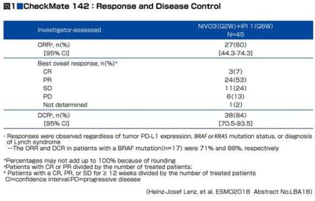 受试者45人,年龄中央值66岁,男性23人(51%)、IV期患者17人(38%)。基准线肿瘤PD-L1发现为1%以上的12人(27%)、BRAF基因突变的17人(38%)、KRAS基因突变的10人(22%),林奇综合征8人(18%)。