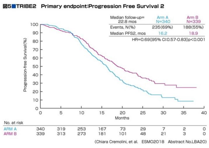 试验解析结果显示,PFS2中央值A群16.2个月,B群18.9个月,B群一线联合FOLFOXIRI化疗+贝伐单抗方案延长生存期是有意义的(图5)。