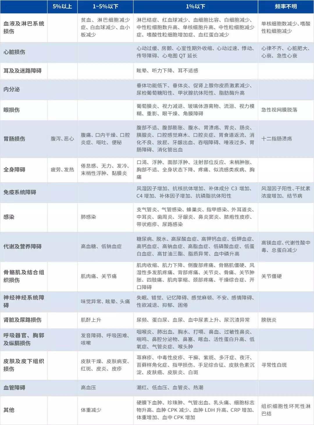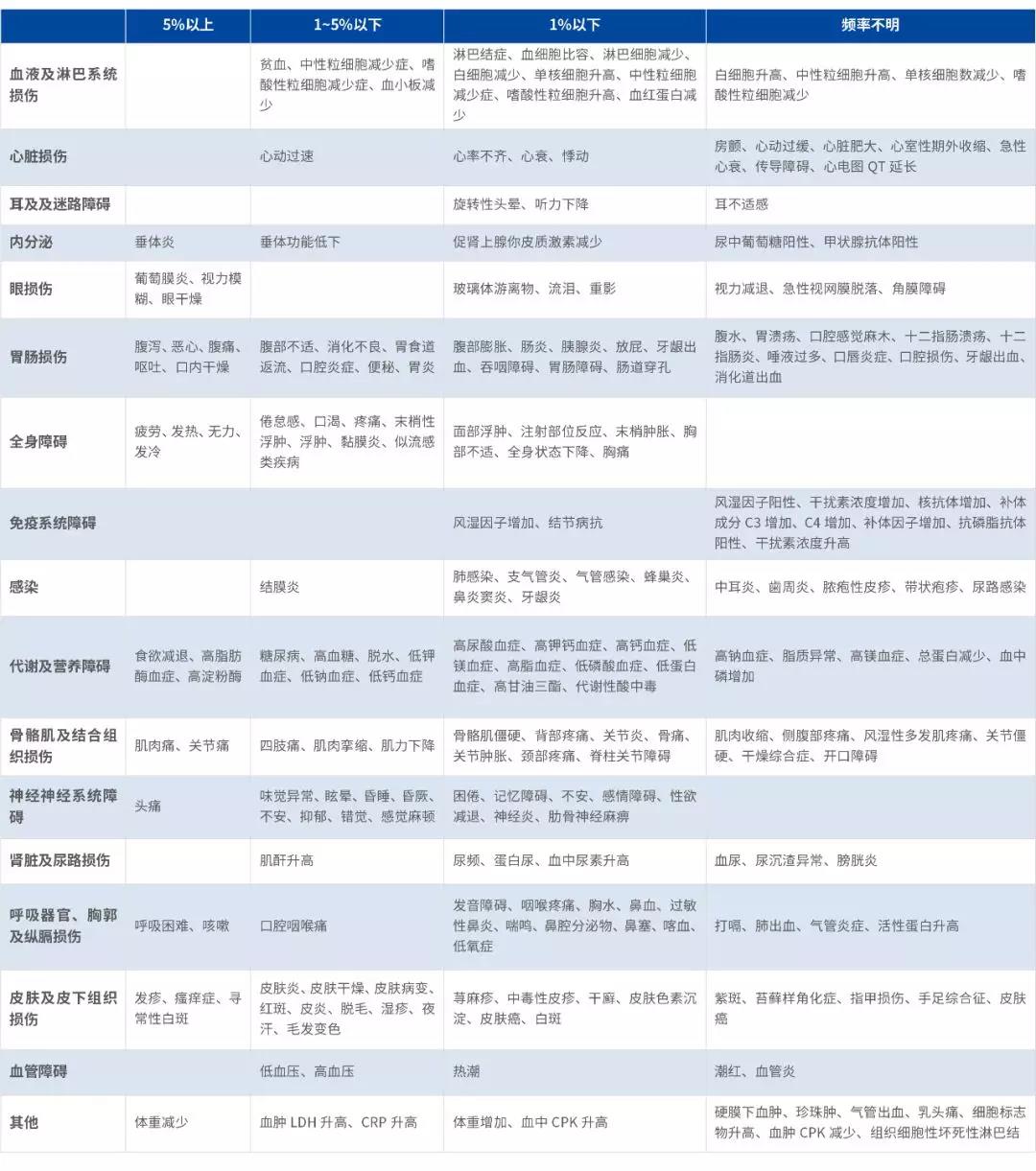 疲劳203例(17.5%)| 瘙痒症132例(11.4%)| 恶心108例(9.3%)| 食欲减退101例(8.7%)| 发诊101例(8.7%)| 腹泻101例(8.7%)| 发热72例(6.2%)| 甲状腺功能低下65例(5.6%)