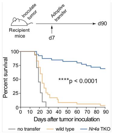 这些研究人员在类似于给患者进行CAR-T细胞灌注的条件下开展测试。他们通过遗传方法对源自患者的T细胞进行基因改造,使得它们成为具有攻击肿瘤能力的CAR-T细胞。这些CAR-T细胞随后被输注到接受肿瘤移植的小鼠体内。 实验组小鼠还接受了基因修饰,从而使得它们的CAR-T细胞缺失了Nr4a家族成员,然而,对照组小鼠保留了这些Nr4a家族成员。