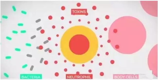 此时,中性粒细胞便停止巡逻,开始前往战场。中性粒细胞战斗起来很疯狂,以至于过程中会杀死健康细胞。在这一点上,它们产生屏障把细菌困住,然后杀死它们。