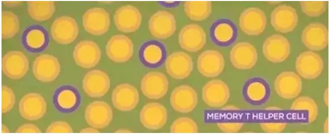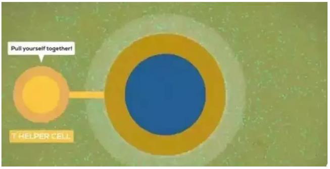 当T细胞出生时,它们会经过困难复杂的训练过程,最后只剩四分之一能通过训练。通过的细胞都会有特殊的装备。而树突细胞正是要找装备寻找辅助T细胞,它在寻找辅助T细胞,去捆绑树突细胞呈现在细胞膜的那部分,当它找到后便会开始连锁反应。