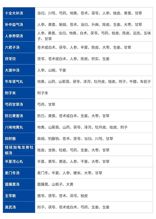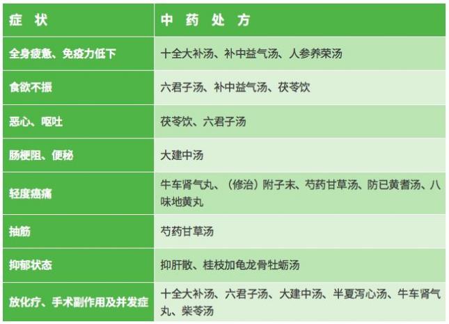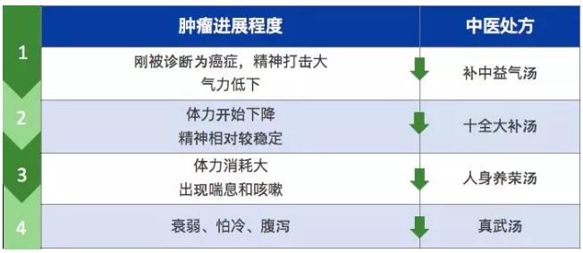 最具代表性的补药是十全大补汤和补中益气汤,人参养荣汤也是癌症患者经常服用的补药。下表按癌症的进展程度举例推荐一些中医药剂。