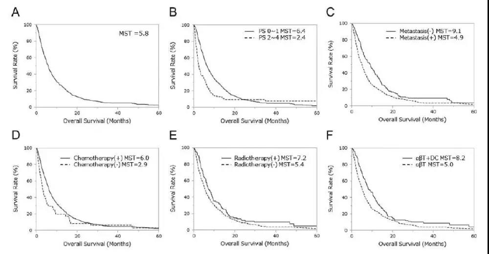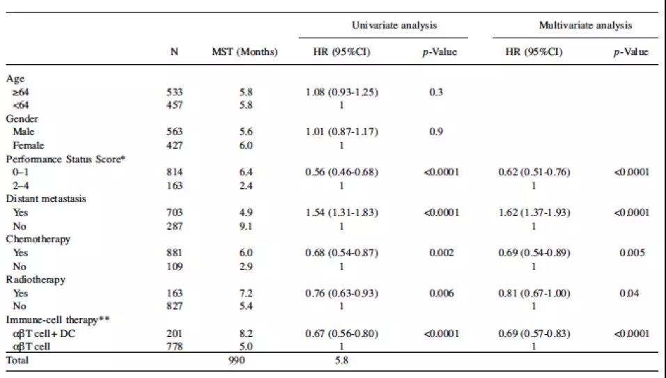 ・免疫细胞疗法中αβT细胞疗法和树突状细胞疫苗联合,与单独用αβT细胞疗法组别对比,统计结果有临床意义(P<0.0001)。