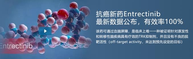 在关键II期STARTRK-2研究中,纳入的是携带NTRK1/2/3-ROS1或ALK基因融合实体瘤患者,结果显示接受患者的客观应答率(ORR,主要终点)为56.9%,并且在10种不同类型的肿瘤(不管基线时是否有脑转移)中都观察到了肿瘤缩小,中位的应答持续时间为10.4个月(次要终点)。特别需要指出的是,对于发生脑转移的患者,恩曲替尼的颅内ORR也有50%。