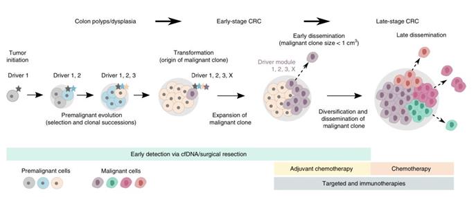 虽然目前肠癌转移的主流模型也是肿瘤经过一系列的克隆进化之后,到晚期才转移。但是也有数据证明,肠癌也是“天生的坏种”,在肿瘤诞生的早期就具备了转移的能力。
