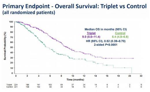 具体结果为:该研究达到了主要终点:与Erbitux+含伊立替康方案治疗的对照组相比,Braftovi三联方案治疗组总生存期(中位OS:9.0个月 vs 5.4个月,HR=0.52[95%CI:0.39-0.70],p<0.0001)和客观缓解率(ORR:26.1% vs 1.9%,p<0.0001)均表现出统计学意义的显著改善。此外,Braftovi三联方案治疗组无进展生存期也表现出统计学意义的显著改善(中位PFS:4.3个月 vs 1.5个月,HR=0.38[95%CI:0.29-0.49],p<0.0001)。