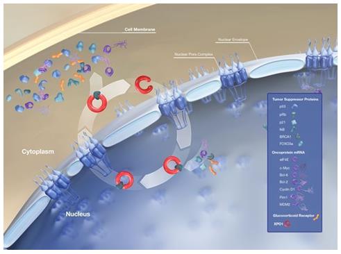 selinexor是一种首创、口服、选择性核输出抑制剂(SINE)化合物,通过结合并抑制核输出蛋白XPO1(又名CRM1)发挥作用,导致肿瘤抑制蛋白在细胞核内积累,这将重新启动并放大它们的肿瘤抑制功能,导致癌细胞选择性凋亡,同时不会对正常细胞造成显著影响。