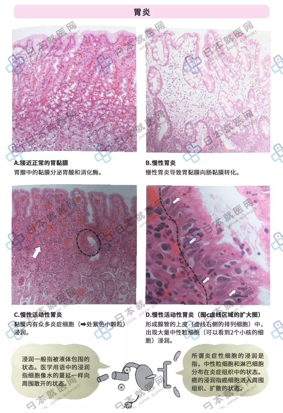 幽门螺旋杆菌之所以能在胃中强酸环境下生存,是因为氨可以局部性中和胃酸,保持幽门螺旋杆菌的生存环境。用显微镜观察有很多幽门螺旋杆菌的胃粘膜上皮时,可以发现淋巴细胞、浆细胞、中性粒细胞浸润,这些都是炎症指标。这种情况是慢性炎症叠加急性炎症的产物:慢性活动性胃炎。幽门螺旋杆菌在胃酸中长期生存,持续伤害胃粘膜。