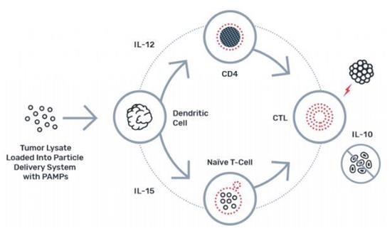 TLPLDC是一种自体治疗性癌症疫苗,由患者自身癌细胞制成,旨在刺激免疫系统识别肿瘤细胞并对抗患者特定(或独特)癌症:(1)这款免疫疗法通过在具有病原体相关分子特征(PAMPs)的颗粒内呈递肿瘤抗原;(2)携带肿瘤抗原的呈递病原体触发先天性和适应性双重免疫反应;(3)分泌高水平IL-12和IL-15,产生高亲和力CD8细胞毒性T细胞;(4)这一机制使反应克服IL-10抑制、在肿瘤处减少Treg、增加CD8 T细胞。