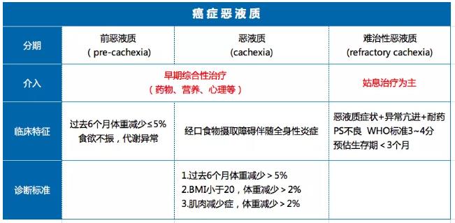 该指南将恶液质分为三个阶段:“前恶液质”,“恶液质”和“难治性恶液质”,并提倡以下诊断标准。