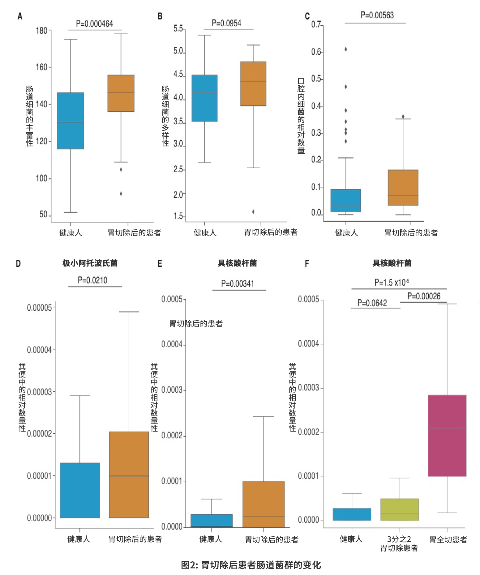 ★★对比健康人群,胃切除患者的肠道内细菌种类更加丰富,具有多样性。说明胃切除后,肠道内环境发生了变化。例如其中一项变化显示:胃切除患者口腔内细菌数量较健康人偏多。