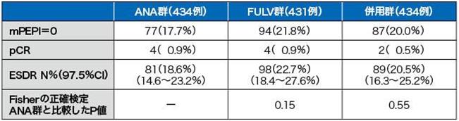 分析的结果是,mPEPI评分为0分的在ANA组,FULV组和联合组分别为17.7%,21.8%,20.0%; pCR分别为0.9%,0.9%,0.5%;而两者综合ESDR分别为18.6%,22.7%,20.5%,与ANA组相比,FULV组和联合组之间无显著差异(表)。