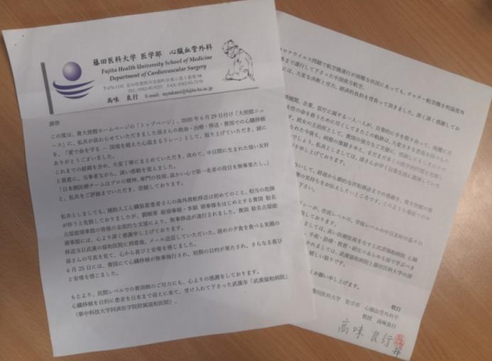 正如你在信中所讲的那样,这场“生命接力”转运的不仅是一名亟待接受治疗的患者,更是中日民间蕴藏的友好和善意。这段佳话经过两国新闻媒体的报道,在民众间引发热烈反响,在社交媒体上,“中日生命接力”成为大家津津乐道的话题。很多朋友都向我询问详情,向小孙表达祝愿,向医护人员致敬,为这场“生命接力”点赞。这场“救心”接力让“中日友好”四个字深深刻在了每个亲历者和目击者的心中,这份感动和善意也值得我们用心传递下去。
