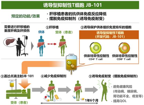顺天堂大学团队在研究中发现了诱导型抑制性T细胞(JB-101),这种T细胞会针对性地抑制对供体器官的免疫排斥反应,可长期诱导无排斥的免疫耐受状态,并于2016年利用诱导型抑制性T细胞成功地让肝移植患者完全脱离了免疫抑制剂。