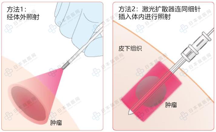 光免疫疗法所使用的激光由一种被称为激光扩散器的光纤激光器发出。照射方法有2种,第1种是通过激光扩散器经体外直接照射肿瘤的表面;还有1种则是使用细针穿破皮下组织,将激光扩散器插入体内进行照射。根据肿瘤的部位、大小,使用1种或同时使用2种照射方法。