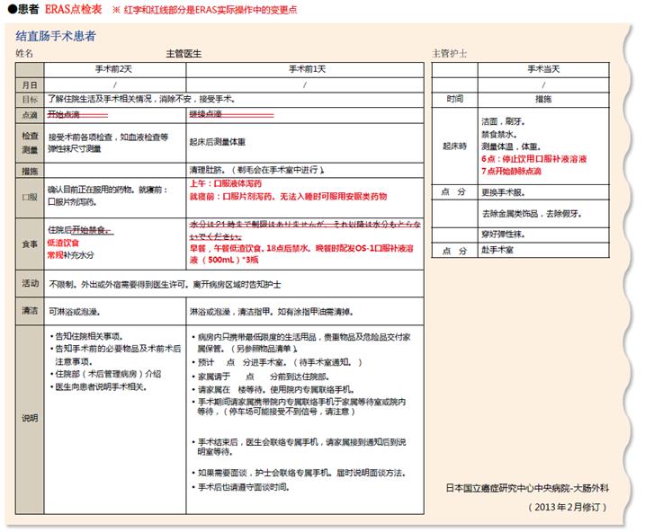 日本国立癌症研究中心中央病院于2014年2月17日开始为大肠外科手术患者启用了ERAS模式(加快康复程序)。