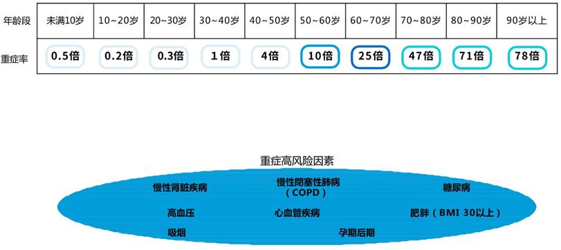 A:新冠病毒感染者中更有可能成为重症患者的高风险人群:老年人、有基础疾病的人,以及孕妇和儿童。可能增加重症风险的基础疾病包括:慢性阻塞性肺疾病(COPD)、慢性肾脏疾病、糖尿病、高血压、心血管疾病、肥胖和吸烟。