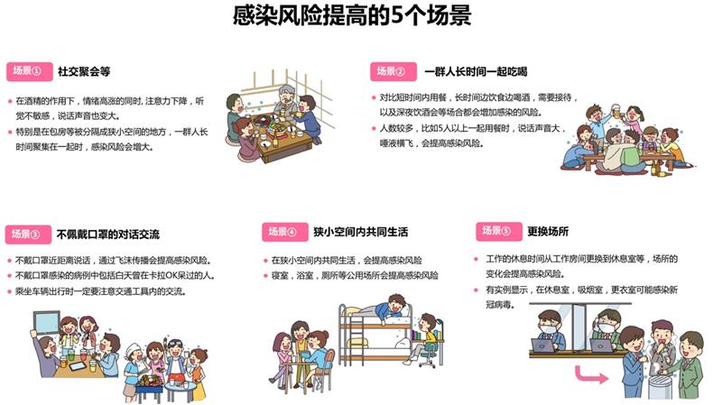 另外,在酒会等社交聚会上、一群人长时间不戴口罩,在狭小空间中吃喝交谈时,即使更换场所,仍然容易被感染,必须引起注意。