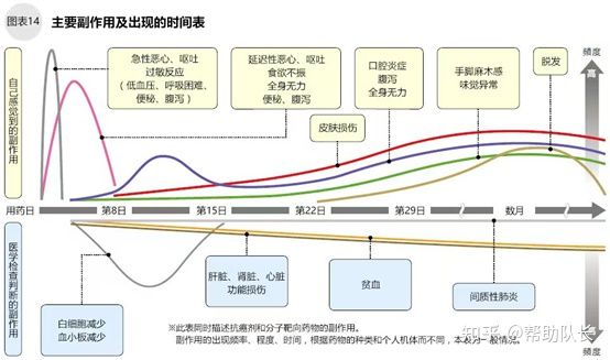 抗癌剂的主要常见副作用是恶心、呕吐、脱毛、白细胞减少。增殖旺盛的正常细胞与癌细胞(具有增殖旺盛的特性)一起被抗癌剂攻击而引发这些副作用,消化管粘膜细胞、毛根细胞、骨髓血细胞都是增殖旺盛的正常细胞。请注意,副作用并不是化疗是否有效的晴雨表,没有副作用发生不等于没有抗肿瘤效果。不同化疗药物的常见副作用不同,比如紫杉醇制剂含有大量的酒精,注射后不能驾驶。