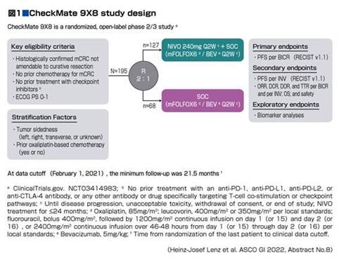 CheckMate 9X8 试验将受试者随机分为四组:未接受化疗,未接受免疫检查点抑制剂治疗,接受纳武利尤单抗+标准治疗(mFOLFOX6 + 贝伐单抗),仅接受标准治疗(图 1)。