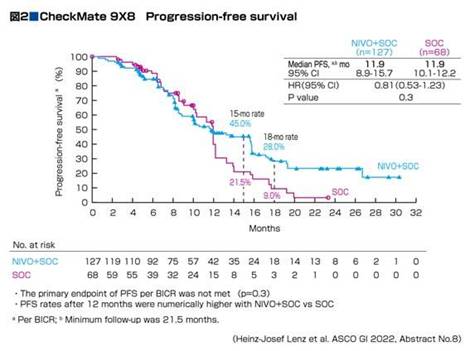 mFOLFOX6+贝伐单抗的一线治疗时加入纳武利尤单抗,并没有显著延长无进展生存期(PFS)。