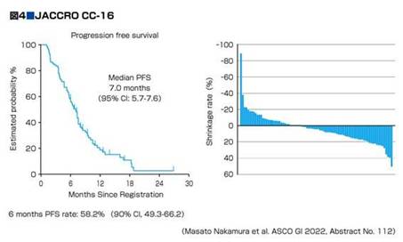 6 个月 PFS 率为 58.2%(90% CI:49.3-66.2),达到了主要终点。中位 PFS 为 7.0 个月,这是一个相当不错的结果(图 4)。不过,RAS野生型结直肠癌本来就预后良好,而且化疗有效,符合预期结果。